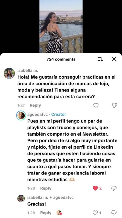 He desarrollado la literacidad de collective intelligence a través de Instagram y TikTok, donde sigo mujeres de mi edad que hablan sobre publicidad y la industria de la belleza. Como me encuentro actualmente en el proceso de encontrar prácticas internacionales para el semestre que viene, me interesa mucho su contenido. Muchas comparten y hablan sobre sus experiencias consiguiendo prácticas o trabajando en el sector de manera internacional o en compañías en las cuales me gustaría trabajar. Cómo se siente como un espacio seguro y se ven que son personas que tienen mucho conocimiento sobre el tema, suelo hacer preguntas en los comentarios para pedir consejos y aprender desde sus experiencias. A través de estas interacciones, aprendo junto a una comunidad digital y construyo conocimiento de manera colaborativa.